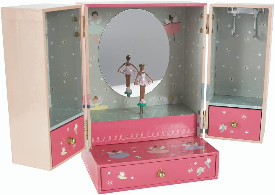 Išskirtinio grožio muzikinė papuošalų dėžutė-spintutė. Iš tiesų primena princesės rūbų spintą. Viską galima susidėti už dviejų durų ir net trijų pastalčių. Specialūs pakabukai skirti pasikabinti papuošalams. Yra veidrodėlis ir prieš jį šokanti balerina.