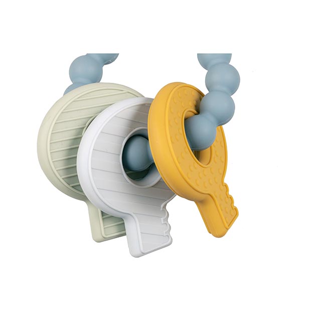 The appearance of the first teeth is a milestone but not always comfortable for your baby. To soften the pain we have created this multifunctional teething toy in the shape of a keychain. It is multifunctional: it’s a fun toy and it will provide soothing comfort and helps stimulate the eruption of your baby’s new teeth. The keychain has different textures which makes it challenging for you baby to chew on. It’s specially designed for little fingers to grasp!