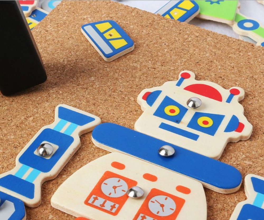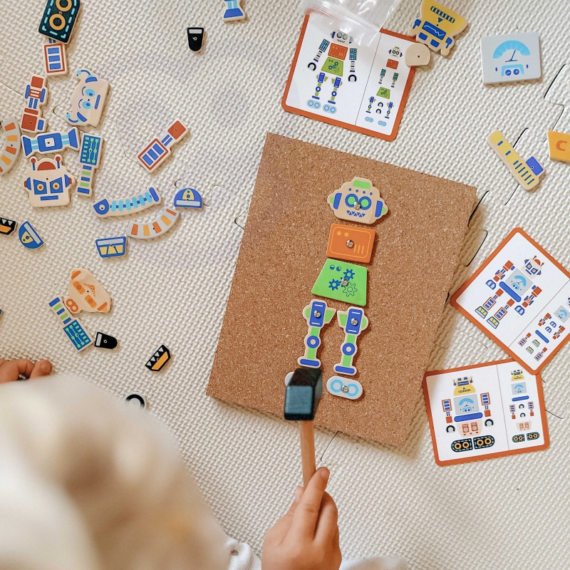 Medinis figūrėlių kalimo rinkinys vaikams. Dėžutėje vaikai ras visas reikalingas priemones sukurti spalvingą robotą. Ant kamštinės lentos dedami žaidimo elementai, tvirtinami vinutėmis ir prikalami plaktuku – taip kuriamas robotas.