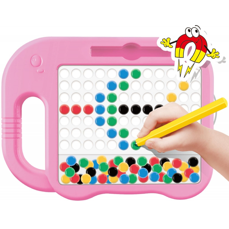 Magnetinis linksmasis žaidimas. Kūrybinis žaidimas kuris labai patiks vaikams. Pagal pateiktas kortelių pavyzdžius sudėliok 84 vnt magnetinių detalių piešinį ar sukurk piešinį pats. Apskritimo formos plokščias detales galima perkelti iš vienos vietos į kitą dėka specialaus magnetinio pagaliuko. Ne tik žaismingas žaidimas, bet ir puiki lavinamoji priemonė, kuri ugdo kūrybiškumą, lavina akių rankų motoriką, koordinaciją. Žaidimas uždengtas skaidriu organiniu plastiku, todėl detalės neiškris. Tinkamas žaisti kelionės metu.