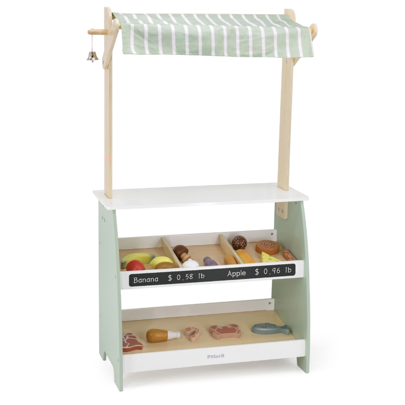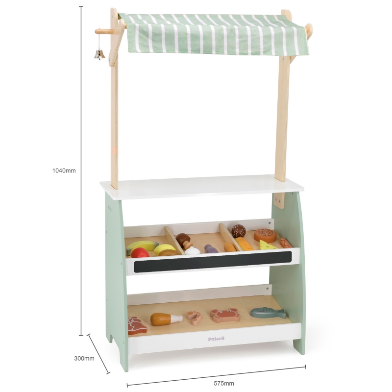 Milžiniška ir realistiška, su daugybe lentynų produktams susidėti. Gan talpi, todėl patogiai pastatysite tiek prekes, tiek kasos aparatą ar svarstykles. Prekystalis pagamintas iš medienos, tvirtas ir ilgaamžis. Juo galima žaisti tiek namuose, tiek vaikų kambariuose ar darželiuose. Virš prekystalio kabo medžiaginis tentas, yra kreidinė lentelė, kurioje dienos pasiūlymus ar nuolaidas galima užrašyti kreida ir net žaismingas varpelis. Į rinkinį įeina 18 medinių produktų.