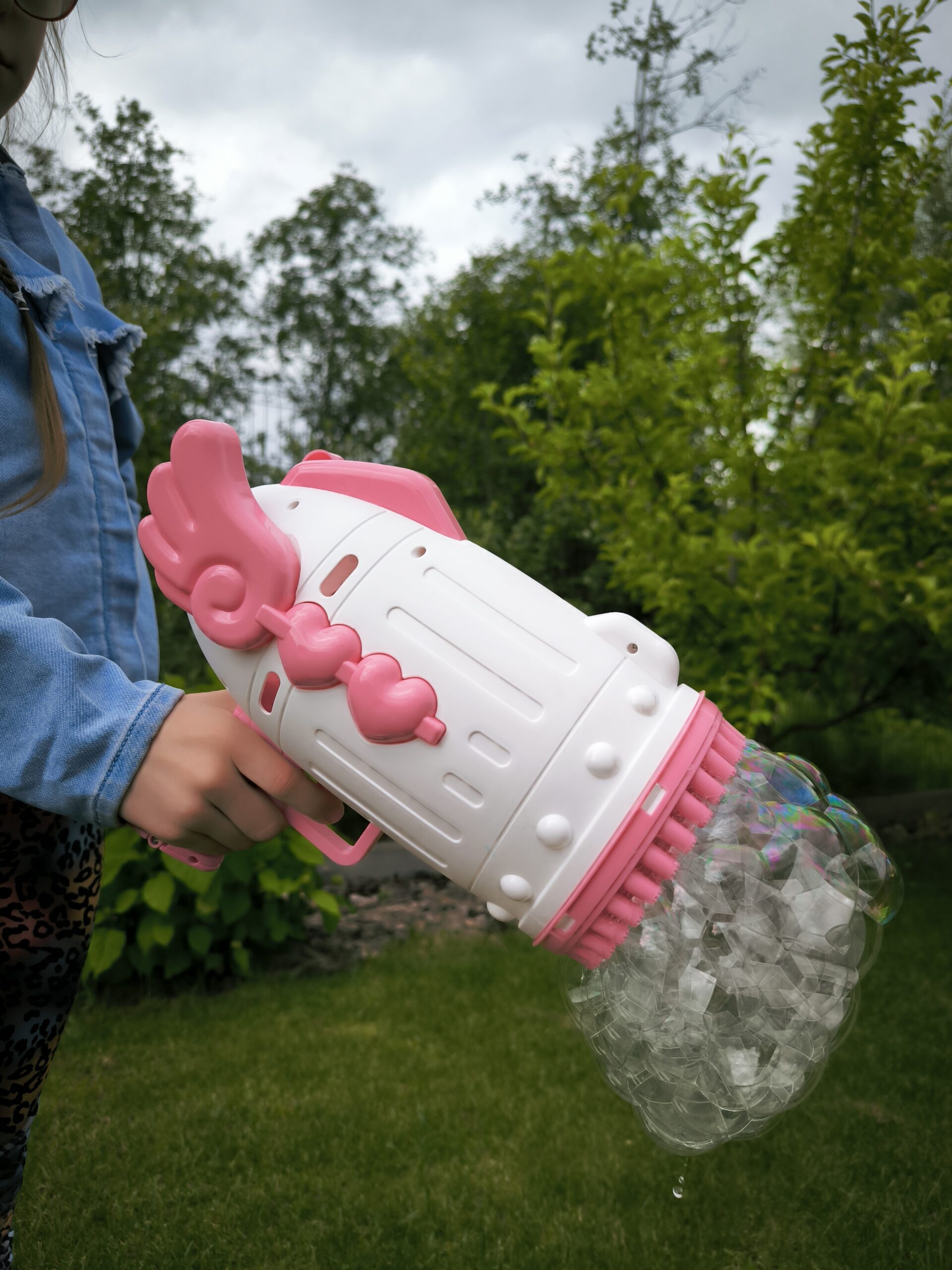 Muilo burbulų šautuvas, kuris vienu metu gali paleisti net 91 muilo burbulus! Tereikia pamirkyti šautuvą į muilo burbulų skystį, paspausti mygtuką ir burbulai prad;s skristi. Šautuvą galima pakrauti. Jis puikiai tiks gimtadieniui, krikštynoms ar smagiausioms pramogoms lauke. Į rinkinį įeina: pistoletas, dubenėlis, 2 x burbulų skystis, USB įkroviklis, įkraunama baterija.