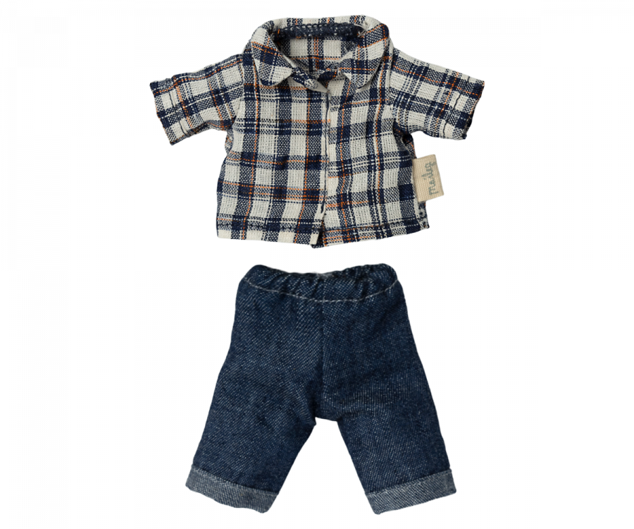 Koks stilingas tėtis peliukas! Jis apsirengęs laisvalaikio rūbeliais ir skuba pas savo peliukų Maileg šeimyną.