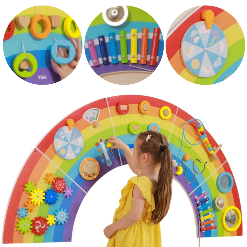 Ryški, lavinamoji sieninė lenta vaivorykštės formos, kurioje rasite 12 skirtingų veiklų: besisukantys krumpliaračiai ir diskai, formų rūšiuoklę, muzikinį ksilofiną, ergonominę karoliukų spiralę, veidrodį, orų lentelę ir kt. Visos veiklos suskirstytos į 5 dalis, vienu metu bus patogu žaisti keliems vaikučiams.