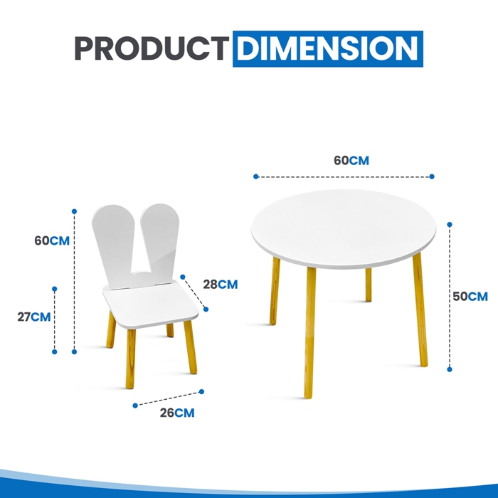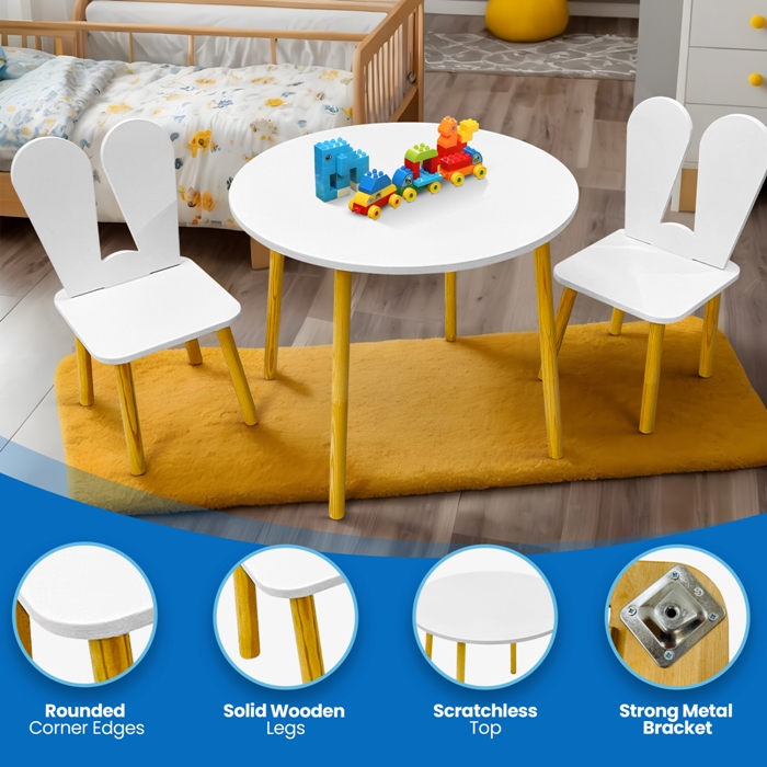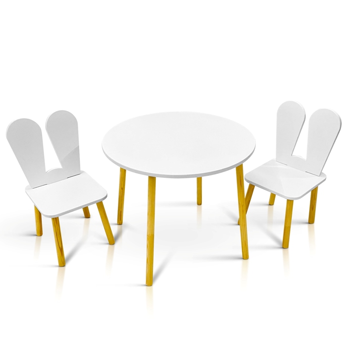 Kokybiški, tvirti baldai vaikams. Rinkinį sudaro staliukas ir dvi žaismingos kėdutės, kurių atlošas imituoja zuikio ausytes. Baldai pritaikyti mažiems vaikams. Prie staliuko vaikai galės smagiai žaisti, piešti ar skaityti knygeles. Šie baldai taps tikra kambario puošmena.