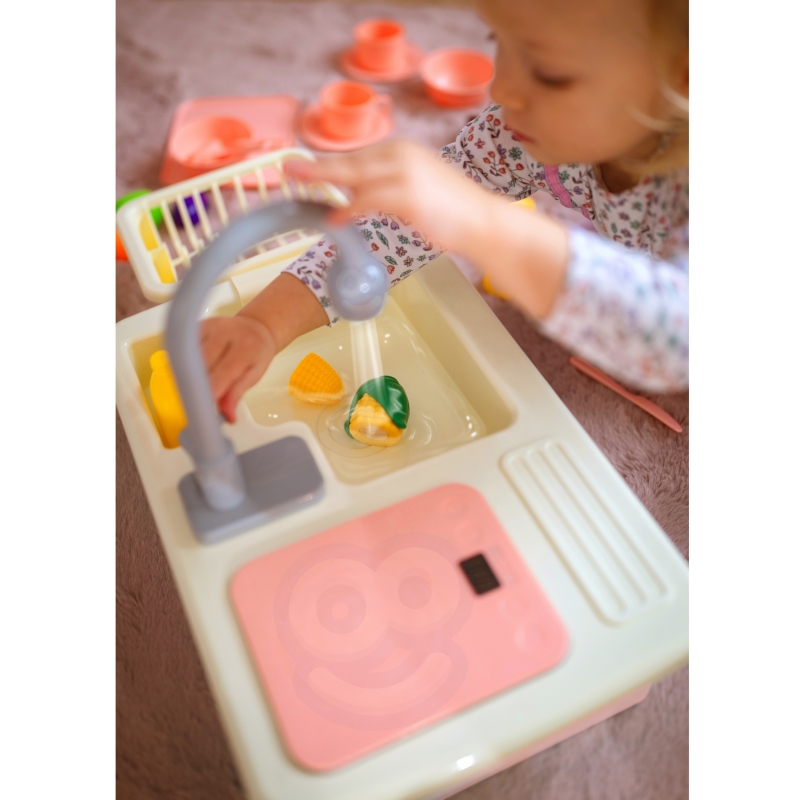 Plastikinė virtuvėlė kriauklė su bėgančiu vandeniu ir šviečiančia kaitlente. Nedidelė, lengva, žaisminga virtuvėlė. Rinkinyje yra maisto produktai (pjaustomi, jungiami tarpusavyje Velcro lipduku). Ja taip smagu bus žaisti lauke vasaros metu. Rinkinyje yra virtuvėlė, maisto produktai, indai. Gamink skaniausius patiekalus, o paskui nepamiršk išplauti indus.